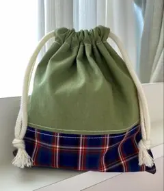 ハンドメイド コップ袋・給食袋 オリーブ×ネイビーチェック