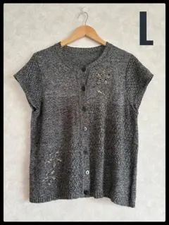 シニア ミセス グレー ニットベスト セーター 花刺繍 ゆったり 大きい L